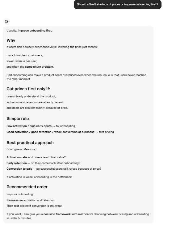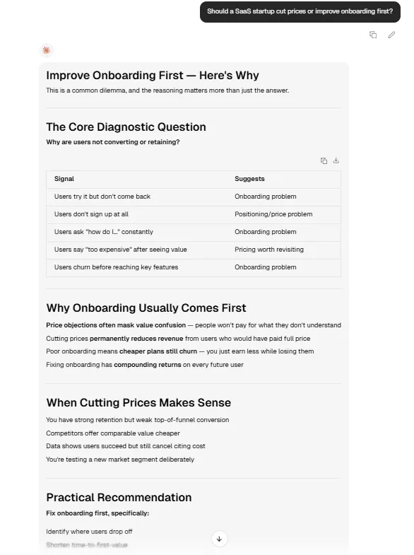 - Example: If you ask both models, “Should a SaaS startup cut prices or improve onboarding first?” Claude is more likely to weigh tradeoffs and challenge the framing, while ChatGPT may give a faster but more agreeable response.